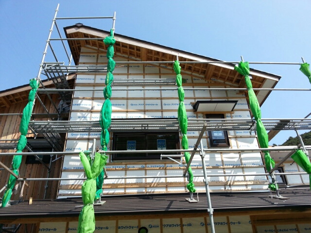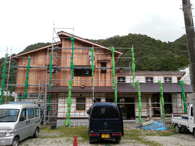 本日道路正面側。二階部分を張っていきます。 夕方にはこんな感じ。 大分雰囲気も出てきました。 板壁が周りの景色と調和してくれています。 バックの裏山が更にこの家を惹き立たせてくれているのでしょう。 二階部分ではクロス屋さんが、クロスを貼りにきてくれました。 岡本夫妻また都合のよろしい時見に来てください♪ 今日は二階の洗面、廊下、WCLのとこを貼っていてくれたので、2,3日後なら二階部分の部屋も貼り終わっていると思います。 思考錯誤して決めたクロスもいい感じですよ。 ランキングに参加しています。 倉谷建築を応援して下さる方は、 読み終えた後に↓↓↓クリックをお願いします。 にほんブログ村 新宮市の工務店、倉谷建築のホームページ↓↓↓ HP:http://www.kuratani-kenntiku.com/ PR |